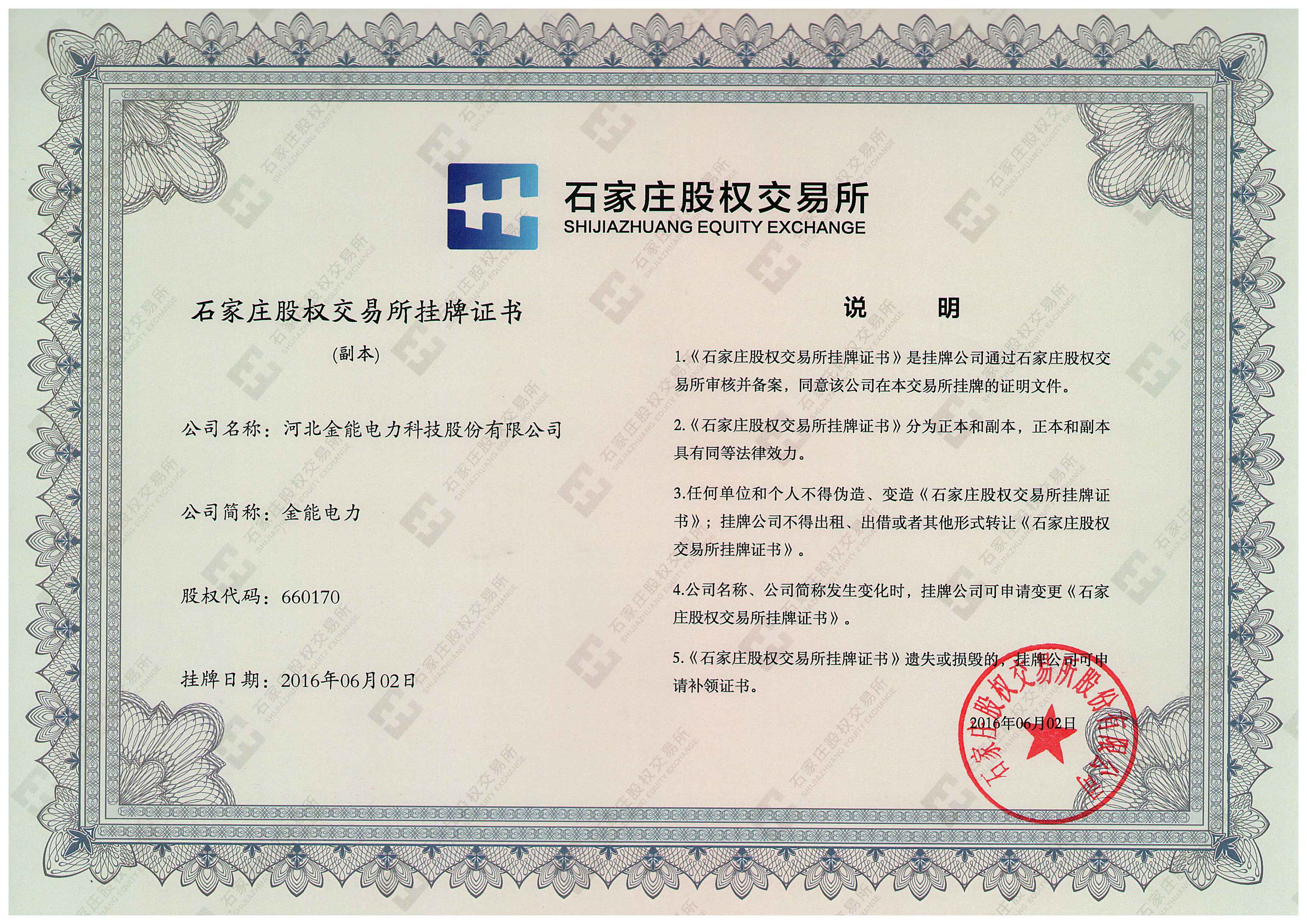 石家莊股權交易所掛牌證書